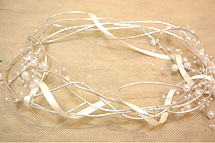 樹脂コーティングしたワイヤーで、リースを作ります。リースの大きさは、内側が花器に乗るように作ってください。リースにリボンとパールを付けます。