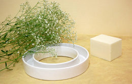 リング型の花器に、レインボーフォームを小さくカットして埋めます。