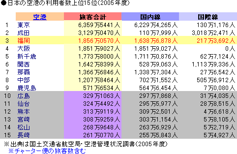 関空や中部国際空港(セントレア)などの大都市圏の空港よりも、福岡空港の利用客数のほうが多いんですね。