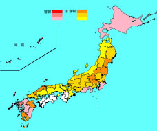 インフルエンザ流行レベルマップは、インフルエンザ定点医療機関(全国に約5,000か所)を受診 したインフルエンザ患者数をもとに、インフルエンザの大きな流行の発生・継続が疑われることを示す警報と、流行の前兆や未終息の状況が見られることを示す 注意報とを、都道府県単位に塗り分けた地図です。
