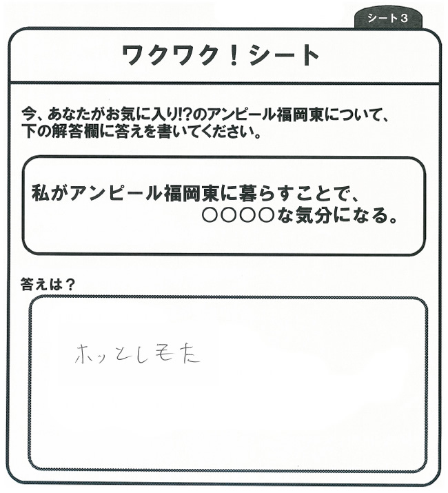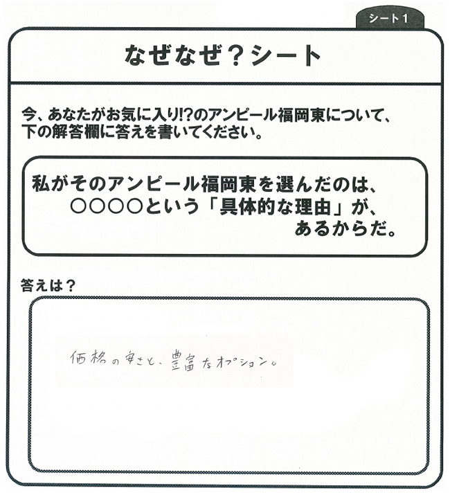 アンピール福岡東 実際にご契約をされたお客様にお答えいただいた「直筆」のアンケートを紹介いたします。 ※アンケートイメージはクリックで拡大します 全て表示 20代 30代 40代 50代 アンケート Q1.私がアンピール福岡東を選んだのは、○○○という「具体的な理由があるからだ」 G様/20代 M様/30代 M様/30代 G様/20代 M様/30代 M様/30代 K様/20代 M様/30代 K様/30代 O様/30代 Y様/40代 N様/50代 K様/20代 M様/30代 Y様/20代 K様/40代 O様/20代 Y様/40代 T様/40代 F様/40代 U様/30代 F様/30代 アンケート Q2.そのアンピール福岡東は、私の生活に○○○を与えてくれる。 G様/20代 M様/30代 M様/30代 G様/20代 M様/30代 M様/30代 K様/20代 M様/30代 K様/30代 O様/30代 Y様/40代 N様/50代 K様/20代 M様/30代 Y様/20代 K様/40代 O様/20代 Y様/40代 T様/40代 F様/40代 U様/30代 F様/30代 アンケート Q3. G様/20代 M様/30代 M様/30代 G様/20代 M様/30代 M様/30代 K様/20代 M様/30代 K様/30代 O様/30代 Y様/40代 N様/50代 K様/20代 M様/30代 Y様/20代 K様/40代 O様/20代 Y様/40代 T様/40代 F様/40代 U様/30代 F様/30代