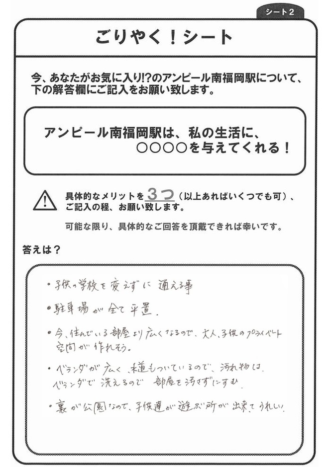 アンピール南福岡駅 実際にご契約をされたお客様にお答えいただいた「直筆」のアンケートを紹介いたします。 ※アンケートイメージはクリックで拡大します 全て表示 30代 40代 50代 アンケート Q1.私がアンピール南福岡駅を選んだのは、○○○という「具体的な理由があるからだ」 A様/30代 F様/40代 K様/40代 A様/30代 F様/40代 K様/40代 M様/50代 アンケート Q2.私がアンピール南福岡駅に暮らすことで、○○○○な気分になる。 A様/30代 F様/40代 K様/40代 A様/30代 F様/40代 K様/40代 M様/50代 アンケート Q3. A様/30代 F様/40代 K様/40代 A様/30代 F様/40代 K様/40代 M様/50代